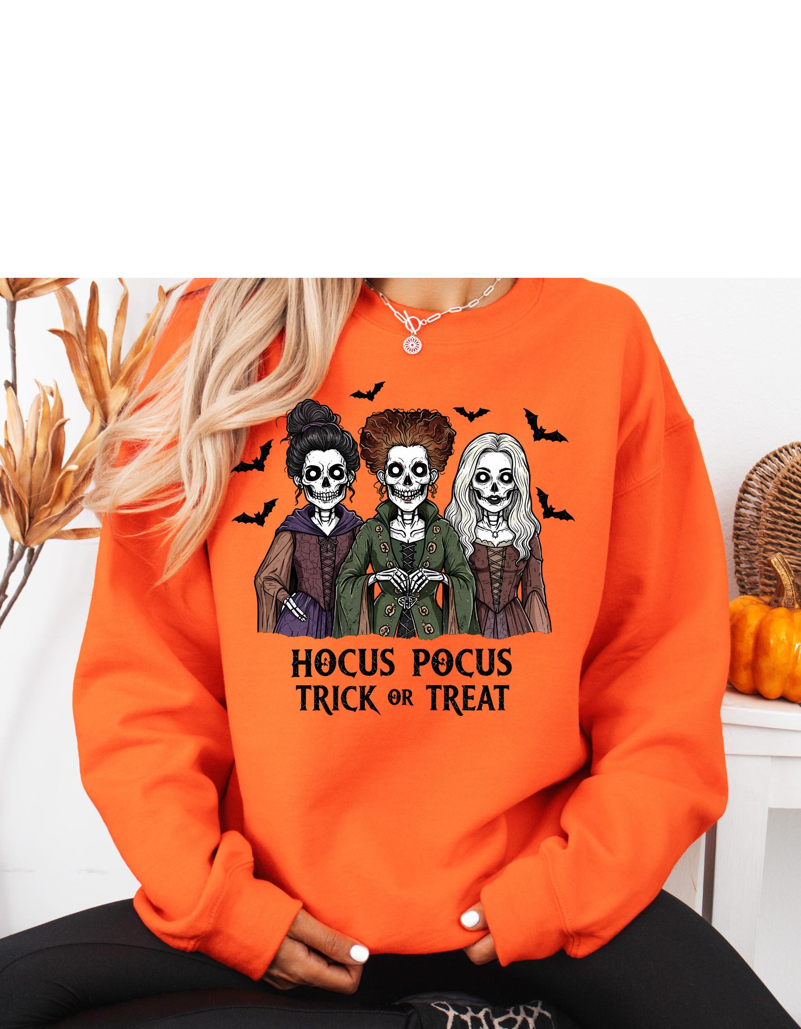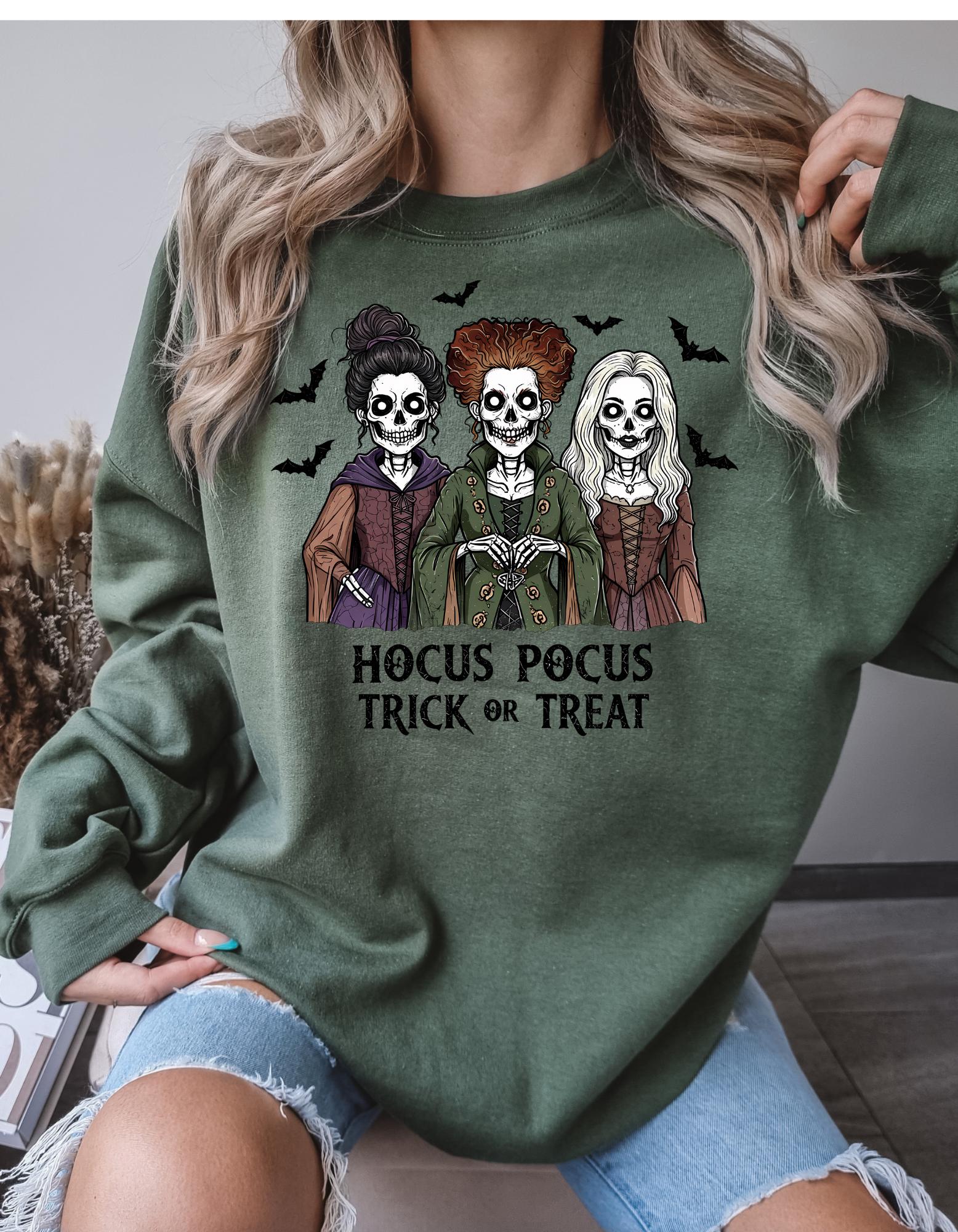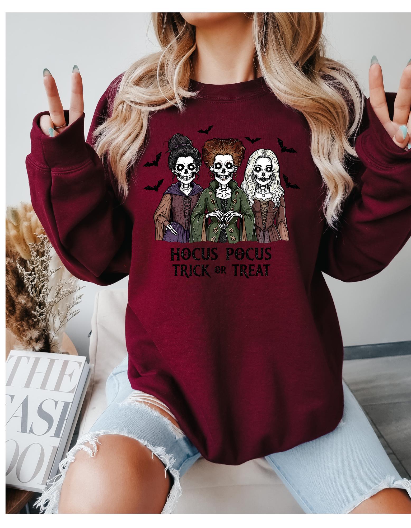 Bring a little magic to your wardrobe with this cozy Hocus Pocus Halloween sweatshirt. This spooky cute sweatshirt is perfect for Fall nights,pumpkin-patches,Halloween parties,or just to be cute running errands. Make this your go to spooky season sweatshirt.