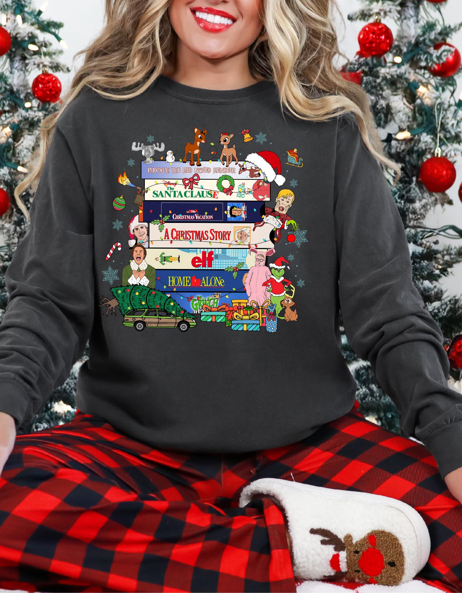 Snuggle up with one of your favorite christmas movies with this retro festive long-sleeve shirt. represent your love for Christmas movies wearing this cozy shirt curled up by the fire and your favorite flannel pants.