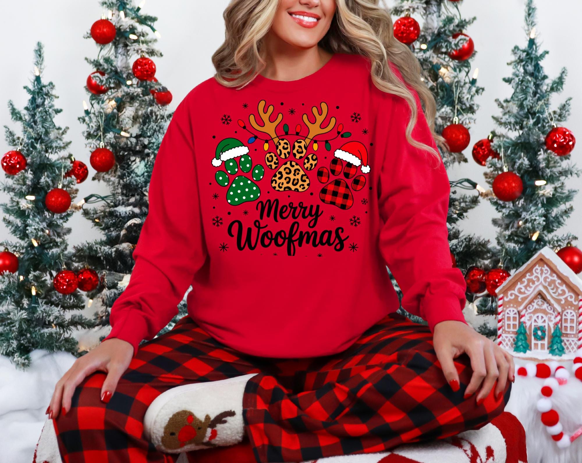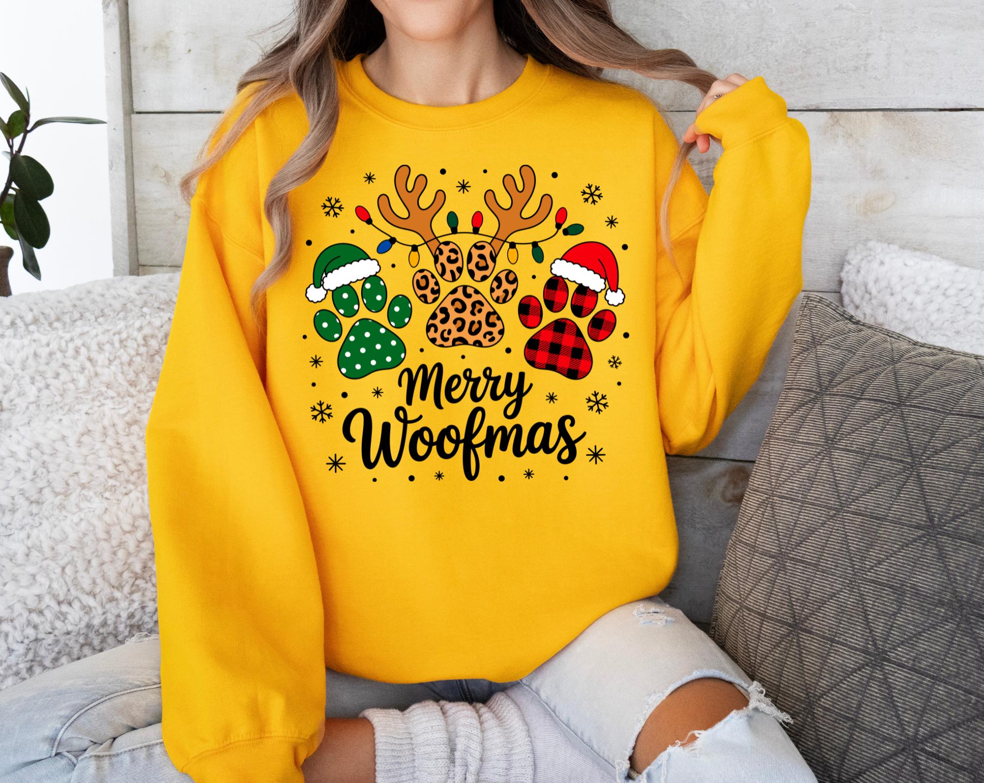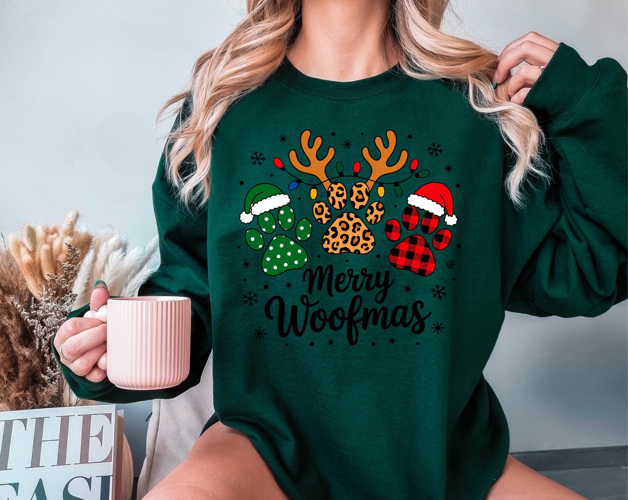 Celebrate the season in the cutest way possible with this festive " Merry Woofmas" Christmas sweatshirt! Featuring adorable paw prints and playful lettering, this cozy crewneck is perfect for dog moms, dog dads, pet sitters, groomers, or anyone who beleives Christmas is just better with a wagging tail.
